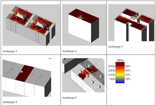 Archetype 5 comprised single family, pitched-roof, semi-detached ground + one-storey homes. Given the presence of a pitched roof, the geometric analysis involved some complexity. The need or otherwise for substructure was verified by analysing whether the pitch angle of the roof itself sufficed for optimal solar capture. The protruding elements housed on the roof, including skylights, chimneys and small-scale machinery, were also taken into consideration for due to the shadows cast over the roof by those elements less than 50% of its area receives the maximum yearly irradiance (3803 h).