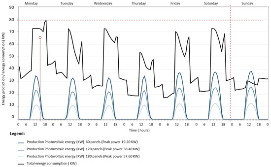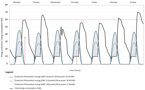 The consumption–output analysis was performed with data for a full week (Monday through Sunday) in March. Total consumption (black line in Figure 4, with an upper limit of approximately 25 kW at peak hours) showed that consumption declined on the weekend, when in-home use and activity differed from the rest of the week. Output was likewise graphed (blue lines in Figure 4) for three peak power/number of panel scenarios.
