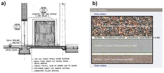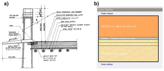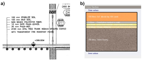 The construction material properties were extracted based on references [36,37,38,39,40,41] and the data entry was divided into four categories—(1) roof floor layers, (2) ground floor layers, (3) typical floor levels, and (4) external wall layers. As shown in Figure 5, the roof comprises a wooden athel beam 15–20 cm in diameter, a palm bot layer 3 cm thick, 1 cm of date palm leaves, a non-woven layer, and a stabilized soil layer 20 cm thick. Furthermore, the ground floor consists of compacted filling material, polyethylene layer for thermal insulation, 10 cm of reinforced concrete, 2 cm of cement mortar, and 6 cm of Riyadh stones, as shown in Figure 6. As shown in Figure 7, the first-floor layers are divided into 15 cm of wooden athel tree trunk beam, 3 mm of palm bot, 1 cm of palm leaves, a non-woven polyester layer, 10 cm of mud soil, and 10 cm of stabilized earth. Finally, the external wall is stabilized earth bricks 40 cm thick with external and internal stabilized earth render 3 cm thick. The total U-values for the roof floor, the ground floor, the first floor, and the external wall layers are 0.441 W/m2·K, 0.779 W/m2·K, 0.406 W/m2·K, and 1.737 respectively.