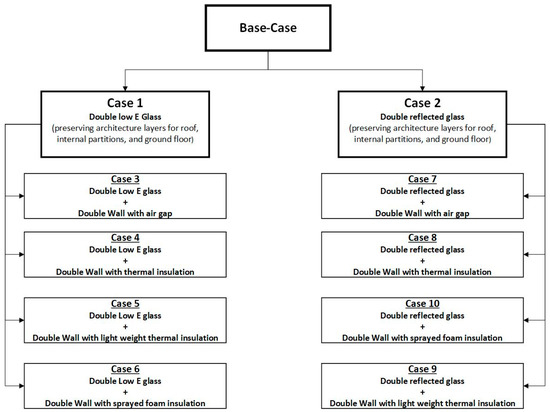 According to the heritage character of the building, the selected passive interventions took place to improve the energy performance of the building and indoor thermal comfort. The improvement took place with minimum intervention and retrofitting actions to preserve the heritage entity of the exterior building shape and the internal character of the building as much as possible. A total of 10 scenarios that were utilized, as shown in Figure 8, including (1) replacing the existing single glass with double low-E glass with a 13 mm air-filled gap that decreases the U-value from 5.360 W/m2·K, as in the base case, to 1.622 W/m2·K; (2) replacing the existing single glass with double reflected glass with a 13 mm air gap that decreases the U-value from 5.360 W/m2·K to 2.294 W/m2·K; (3) using the low-E glass, as in the first scenario, in addition to a 5 cm air gap and 12 cm of rammed earth brick, making the U-value 1.614 W/m2·K; (4) using the low-E glass, as in the first scenario, in addition to 5 cm of expanded polystyrene thermal insulation and 12 cm of rammed earth brick, which achieves a U-value of 0.568 W/m2·K; (5) using the low-E glass, as in the first scenario, in addition to 5 cm of expanded polystyrene lightweight thermal insulation and 12 cm of rammed earth brick, which achieves a U-value of 0.626 W/m2·K; (6) using the low-E glass, as in the first scenario, in addition to 5 cm of expanded polystyrene lightweight thermal insulation and 12 cm of rammed earth brick, which achieves a U-value of 1.408 W/m2·K; (7) using the double reflected glass, as in the second scenario, in addition to a 5 cm air gap and 12 cm of rammed earth brick, making the U-value 1.614 W/m2·K; (8) using the double reflected glass, as in the second scenario, in addition to 5 cm of expanded polystyrene thermal insulation and 12 cm of rammed earth brick, which achieves a U-value of 0.568 W/m2·K; (9) using the double reflected glass, as in the second scenario, in addition to 5 cm of expanded polystyrene lightweight thermal insulation and 12 cm of rammed earth brick, which achieves a U-value of 0.626 W/m2·K; (10) using the double reflected glass, as in the second scenario, in addition to 5 cm of expanded polystyrene lightweight thermal insulation and 12 cm of rammed earth brick, which achieves U-value 1.408 W/m2·K