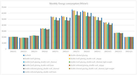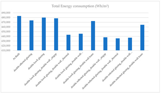 According to the simulations performed using DesignBuilder software, the fourth case (double low-E glass with a double wall enclosing thermal insulation) achieves the minimum total energy consumption of 443,338 Wh/m2 annually, which corresponds to an 8.3% reduction compared to the base case, which is attributed to the minimum U-value. The other nine cases consume 473,875 Wh/m2, 479,941 Wh/m2, 478,284 Wh/m2, 445,552 Wh/m2, 472,506 Wh/m2, 437,958 Wh/m2, 435,721 Wh/m2, 437,086 Wh/m2, and 464,540 Wh/m2, respectively, as illustrated in Table 1 and Figure 9 and Figure 10. Hence, the ten cases achieve reductions in the total energy consumption from the base case as follows: Case 1— 2%; Case 2—1%; Case 3—1.1%; Case 4—58%; Case 5—7.9%.; Case 6—2.3%.; Case 7—9.5%.; Case 8—9.9%.; Case 9—9.6%; Case 10—3.9%.