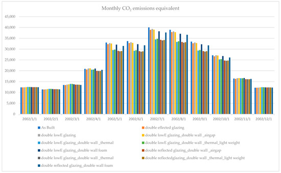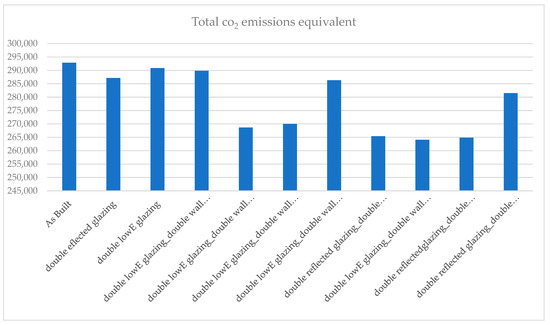Accordingly, the carbon emissions inherit the same reduction characteristics in the ten passive intervention cases, as shown in Table 2 and Figure 11 and Figure 12. Double low-E glass possesses 287,168 Kg CO2 equ, representing a 2% reduction from the base case. Applying double reflective glass emits 290,844 Kg CO2 equ, equal to a 0.7% reduction from the base case. Utilizing double low-E glass and a double wall with an air gap represents a 1.1% reduction, with 289,840 Kg CO2 equ. Applying double low-E glass and a double wall with thermal insulation emits 268,663 Kg CO2 equ, equal to an 8.3% reduction from the base case. Utilizing double low-E glass and a double wall with lightweight thermal insulation emits 270,004 Kg CO2 equ, equivalent to a 7.8% reduction from the base case. Using double low-E glass and a double wall with foam thermal insulation emits 286,338 Kg CO2 equ, equal to a 2.3% reduction from the base case. Using double reflective glass possesses 265,402 Kg CO2 equ, representing a 9.5% reduction from the base case. Utilizing double reflective glass and a double wall with an air gap means a 9.9% reduction with 265,402 Kg CO2 equ. Applying double reflective glass and a double wall with thermal insulation emits 264,047 Kg CO2 equ, equal to a 9.9% reduction from the base case. Utilizing double reflective glass and a double wall with lightweight thermal insulation emits 264,874 Kg CO2 equ, equivalent to a 9.6% reduction from the base case. Using both double reflective glass and a double wall with foam thermal insulation emits 281,511 Kg CO2 equ, which is equal to a 3.9% reduction from the base case.
