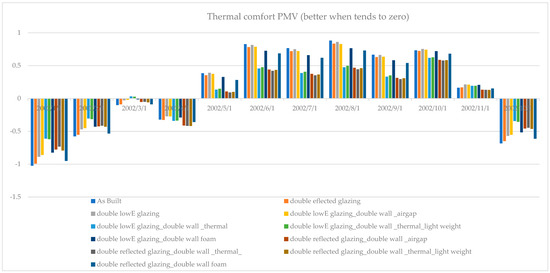 The predictive mean value (PMV) indicates the degree of thermal comfort achieved in a particular space. The value of this metric ranges from a value of 3 to −3, and improvement takes place when the value tends to zero. Therefore, based on Table 3 and Figure 13, Case 4 has the best PMV values compared to the other ten cases, and it improves the indoor thermal comfort better than the base case throughout the twelve months of the year. Moreover, it can be recognized that applying double low-E glass achieves more improvement than using double reflective glass in the winter months.