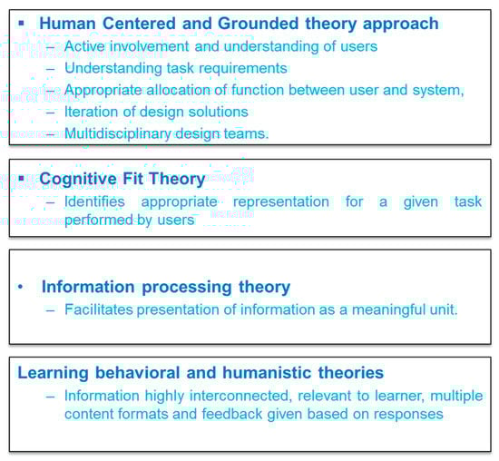 We implemented combined principles of human-centered design, cognitive theory, information processing theory and learning, behavioral, and humanistic theories to conduct user, task, and requirement analysis.