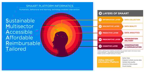 The SMAART informatics platform is an internet-enabled platform that has been designed, developed, and implemented and includes several layers such as (a) information layer (emphasis on data collection), (b) descriptive layer (emphasis on data quality), (c) predictive layer (emphasis on data analytics), (d) prescriptive layer (emphasis on intervention delivery), and (e) cognitive layer (emphasis on dissemination and communication). The layers of SMAART informatics platform facilitates (a) transmission and integration of data, (b) interpretation of data in an evidence-based manner, (c) addressing specific consumer needs, (d) provision of timely feedback to the consumer, and (e) repetition of the feedback loop of information processing. The SMAART informatics platform gathers multi-faceted, multi-level, and multi-dimensional data and analyzes that data into meaningful information that is contextually relevant (Figure 2) [,].