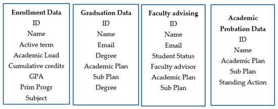 To provide sustainable, multisectoral, accessible, affordable, reimbursable, and tailored solutions for evidence-based academic management, several disparate data sources were recorded. These included student enrollment data, graduation data, academic probation data, and international student data. The goal was to integrate key data fields across all these different data sources in a format that is readily analyzable, useable, and can provide accessible and meaningful information to address the needs of the diverse stakeholders. Each data set had a unique set of variables that were essential and could generate meaningful insights (Figure 4). The unique ID across these various datasets was EMP ID and email address.