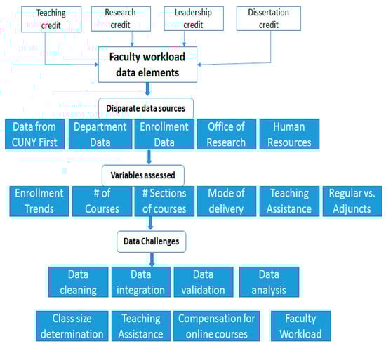 Prior faculty workload data was gathered, and information on various data variables including classroom size, additional teaching assistance, and research effort was all gathered to generate individual faculty workload profiles. Each faculty within the school submitted their faculty workload, and their approval was sought regarding the data validity. In addition, continuous ongoing deliberations with the department chairs and their department faculty and school leadership was done, and supporting data were presented to formulate new policy. Several iterations of the policy were done at the department and then at the school-wide level before a formal policy was institutionalized and ready to be implemented in the fall 2019. Several challenges were encountered in the management and tracking of faculty workload data and included data inconsistency, data redundancy, data completeness, and data reporting (Figure 5). We focused on workload inequity within departments because of the critical role departments play in faculty retention, satisfaction, recognition, and professional growth []. Senior faculty and department chairs can reduce workload inequity with routine practices and conditions that can shape a more positive work allocation experience.