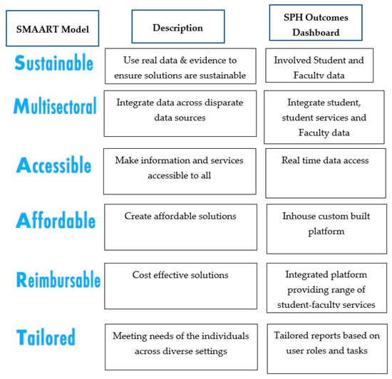 In the SMAART Model, Sustainability highlights the use of real data and evidence to ensure that developed solutions are Sustainable, Multisectoral indicates integration of data from disparate sources to influence outcomes, Accessible indicates making information and services accessible to all, Affordable indicates creating solutions that are affordable to all, Reimbursement reflects upon return on investment with cost-effective solutions, and Tailored indicates meeting the needs of the individuals across diverse settings.