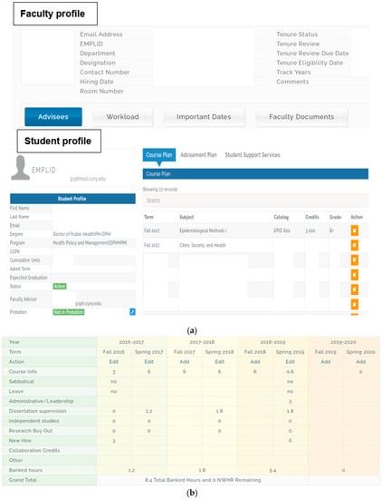 - Faculty workload: Information recorded on each faculty workload included teaching credits, administrative/leadership role, dissertation supervision, independent study, research buyout, new hires, and banked hours. Faculty workload information is gathered on a per-semester basis so that at the end of each year, an aggregated report on faculty workload can be prepared (Figure 8b).