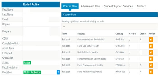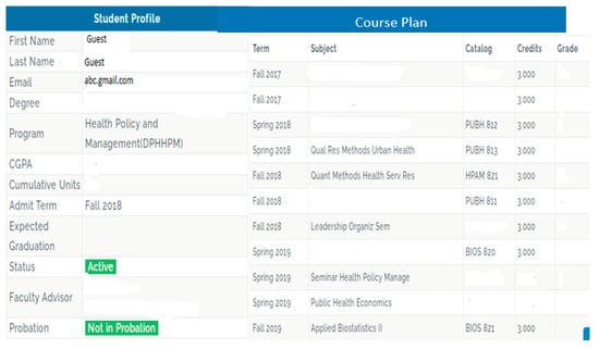 The SMAART student module facilitates individual students in viewing a summary of their profile. Various data elements captured in the profile include: program and degree information, cumulative GPA and credits earned, faculty advisor, and whether the student is in good academic standing. The students can also view a summary of the courses they have taken and the courses left to fulfill their program requirement (Figure 9).