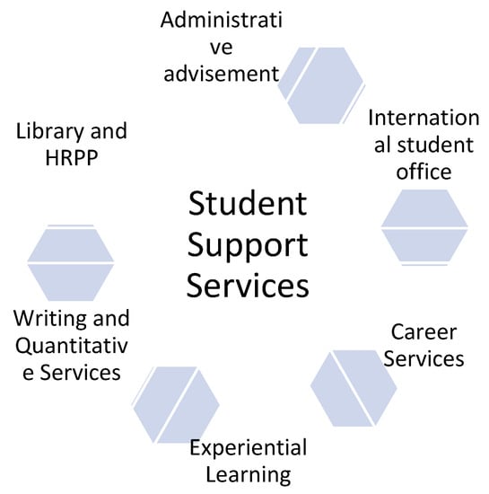 The student support services cover various student services such as administrative advisement, career services, HRPP, International Students, Experiential Learning, library, and quantitative and writing services (Figure 10).