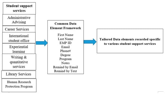 Various student support services recorded data across different platforms such as Microsoft Excel, Google Docs, FlexBooker, Calendly, and LibApps, thus limiting the integration of student service data in a meaningful manner. Some of the common data variables recorded across several student services such as academic advisement, career services, International Student Office, library, Office of Experiential Learning, and writing and quantitative services included first name, last name, email, degree, program, and open-ended information as notes (Table 2). Additional data fields were identified that would help better quantify the student needs and allow us to provide essential services and track its usage.