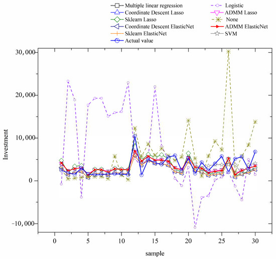 Through the analysis of the results in the above figure, it can be seen that the trends of the results obtained by the three optimization algorithms for the elastic net regression are similar. The regression results obtained by the three optimization algorithms all show a general trend of rising first and then falling, and the highest values are all near the 15th sample. Among them, the regression result under the ADMM optimization algorithm has a higher peak value. The reason may be that in the output result of the elastic net optimized by ADMM, the degree of influence of each variable is more in line with the actual situation, and there is no outlier, so the overall output investment is closer to the actual investment level. The specific regression effect analysis needs to compare the actual investment value of the offshore wind power project with the obtained regression value for error analysis.