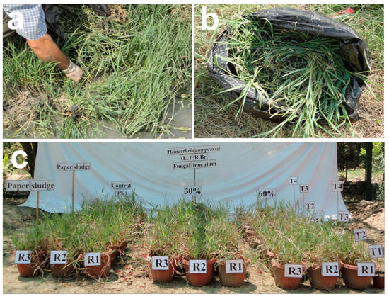 (a–c): Hemarthria compressa (L.f.) R. Br. growing at margins of a pond at industrial site, its collection and experimental arrangement for assessing efficacy of individual and combinatorial fungal treatments in different concentrations of paper sludge.