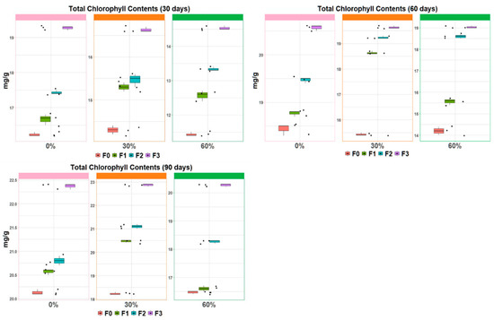 The amount of total chlorophyll contents after 30-, 60- and 90-day intervals was significantly improved with the inoculation of F1, F2 and F3 treatments under control and both PS concentrations (30% and 60%). Inoculation of F3 treatment, significantly boosted the total chlorophyll contents than F1 and F2 in 30 days old plants, but maximum increase was observed in the absence of PS application. However, F2 treatment was more effective under 60% PS application. In 60- and 90-day-old plants, F1, F2 and F3 treatments considerably enhanced the total chlorophyll contents under control and 30%, 60% and PS application, respectively (Figure 3).