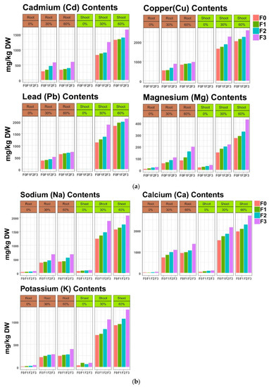 Quantification of (a) Cadmium, Copper, Lead, and Magnesium, (b) Sodium, Calcium, and Potassium in dried tissues of H. compressa plants after 0, 30% and 60% PS treatment with and without fungal application. The values given above indicate mean of 9 replicates. F0 = Control, F1 = Aspergillus niger, F2 = Trichoderma pseudokoningii, F3 = Aspergillus niger + Trichoderma pseudokoningii.