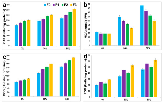 Analysis of antioxidant enzymatic activity and MDA contents in tissues of H. compressa plants after 0, 30% and 60% PS treatment with and without fungal application. The values given above indicate mean of 9 replicates. F0 = Control, F1 = Aspergillus niger, F2 = Trichoderma pseudokoningii, F3 = Aspergillus niger + Trichoderma pseudokoningii.
