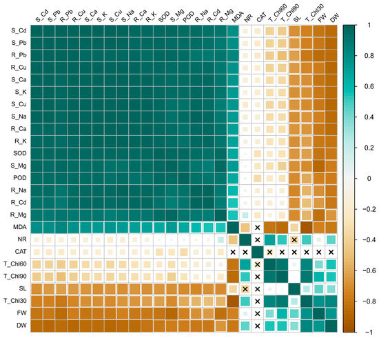 Correlational matrix of all studied attributes in H. compressa subjected to different fungal treatments under various concentration of paper sludge. CAT: catalase; DW: dry weight; FW: fresh weight; MDA: malondialdehyde; NR: number of roots; POD: peroxidase; R_Ca: root calcium; R_Cd: root cadmium; R_Cu: root copper; R_K: root potassium; R_Mg: root magnesium; R_Na: root sodium; R_Pb: root lead; S_Ca: shoot calcium; S_Cd: shoot cadmium; S_Cu: shoot copper; S_K: shoot potassium; S_Mg: shoot magnesium; S_Na: shoot sodium; S_Pb: shoot lead; SL: shoot length; SOD: superoxide; T_Chl: total chlorophyll.