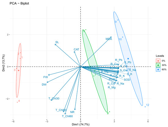 To estimate the association between various parameters in H. compressa and fungal treatments supplied with paper sludge, Pearson correlation and principal component analysis (PCA) was executed. Positive and negative Pearson correlations were recorded between different parameters in H. compressa subjected to fungal treatments and PS. We observed that PS exerted significant variations in physiological and biochemical attributes antioxidant defense, and mineral nutrients and these were related with plant growth and survival (Figure 6). A negative correlation was observed among shoot length with all other attributes except fresh and dry biomass. Total chlorophyll after 30 days, as well as fresh and dry weights were also negatively correlated under PS application and fungal treatment. Mineral nutrients were positively correlated with antioxidative metabolism and MDA. CAT showed no interaction with chlorophyll and morphological characteristics. Number of roots presented a positive correlation with growth attributes. This correlation analysis showed an obvious relationship between varieties of canola and plant characteristics (Figure 6). This correlational analysis between studied characteristics of H. compressa, fungal treatments and PS concentration levels is attested by PCA-Biplot. Figure 7 shows the relationship between concentration levels and studied traits. PC1 and PC2 collectively exhibited 74.7% and 13.7% of the variability in data. PC1 explains a very prominent response of H. compressa parameters subjected to different concentrations of PS. In the dataset, the distributional aspect of components highlights that PS toxicity in the rooting media was significantly influenced by fungal treatments with respect to their studied parameters (Figure 7). This evidently validates that variables in control plants did not significantly match with the same variables in fungal treated plants under different concentrations of PS.