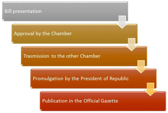 The Italian Constitution establishes that its legislative function is exercised collectively by two Chambers, the Chamber of Deputies and the Senate of the Republic. This means that, to become law, a project must be approved in the same text by both the Chambers. The procedure for the formation of the law (the so-called iter) is divided into successive five main phases (Figure 1): (a) the presentation of the bill, (b) the approval of the Chamber to which it was first presented, (c) the transmission of the text to the other Chamber and its approval in the same wording or with modifications (if it is modified, the project passes from one Chamber to another, until it is approved by both in the same wording), (d) the promulgation by the President of the Republic, (e) its publication in the Official Gazette and its entry into force. At the Chamber of Deputies, the bill can be presented by the Government, by each deputy, by at least 50,000 voters as well as from other bodies.