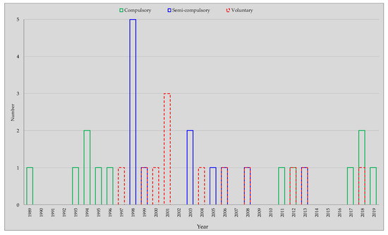 The window of thirty-one years can be divided into three main periods: (1) from 1989 to the first half of the nineties of the twentieth century, where the compulsory system clearly prevailed, (2) from the second half of the nineties and up to the first decade of the 2000s, where semi-compulsory or voluntary systems prevailed, (3) in the second decade of the 2000s, in which the compulsory system prevailed again, but was also flanked by the other two schemes, with a relative prevalence of the voluntary one (Figure 3).