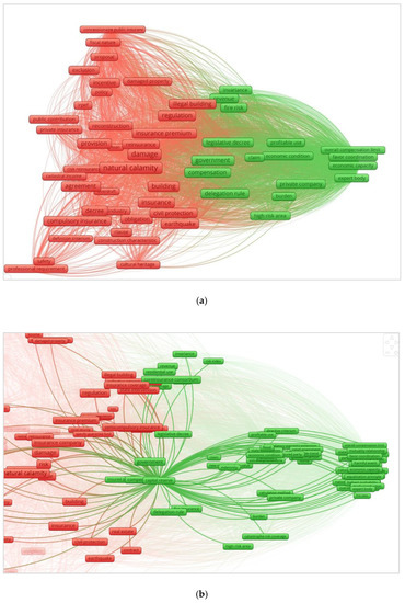 Thirty are the most frequent words (Table 2). The network is dominated by the “natural calamity” term (40 occurrences) which, as expected, is a central term in the map (Figure 4a) as it is a keyword common to nearly all bills or laws. The other most frequent terms refer mainly to: (a) the assets to be protected (building, private property, real estate), (b) the typology of the NHIS and the contractual aspects of insurance policies (e.g., compulsory, semi-compulsory, voluntary, insurance premium, compensation).