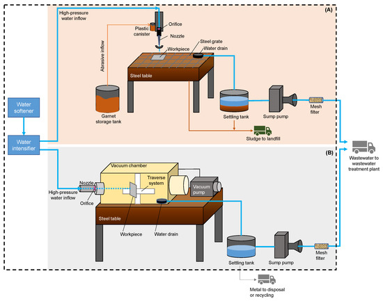 Water entering both systems first passes through a GE Water Softener system (model GXSF30V), where dissolved minerals were removed from standard tap water to protect the following devices. The softened water was then pressurized to 414 MPa (60 ksi) using a Hypertherm HyPrecision 60S waterjet pump powered by a Toshiba 45 kW (60 hp) motor. The high-pressure water flow is then used for metal cutting. The main cutting equipment of the AWJ system is a commercially available model purchased from WARDJet (model E-1515). It primarily contains a cutting head that is comprised of an orifice and a nozzle, a steel table, a steel grate used to clamp the metal to be cut (workpiece, thereafter), and an abrasive storage and injection system (Figure 1A). After the workpiece is clamped, the cutting head can move in three axes to machine the workpiece. Three THK Ball Screws are responsible for moving the jet. When the jet is on, the high-pressure water inflow is passed through an orifice, which accelerates the water into a high-velocity stream before entering a mixing chamber. Meanwhile, abrasive is pumped from the storage tank into a plastic canister as a temporary storage spot. The abrasive particles carried in the air are then mixed with the high-pressure and high-velocity stream in the mixing chamber and exit the cutting head through a nozzle. The nozzle directs the multi-phase mixture of air, abrasive, and water onto the workpiece, allowing the abrasives to erode and cut through the metal. During the cutting, water, larger abrasive sediment, and metal particles from the workpiece settle to the bottom of the steel table. The waste stream will then exit the waterjet system through a drain and go into a settling tank. Heavier particles settle before the wastewater is pumped through a mesh filter. The settled abrasive and metal particles are manually collected and transported to a landfill. Abrasive recycling was not considered in this study because it is costly compared to purchasing a new supply [17], and landfill remains the most common choice of disposal in the AWJ industry. In addition, recycled abrasive particles lose their sharp edge, resulting in reduced cutting effectiveness. In this study, the type of abrasive used is 80 mesh alluvial garnet.