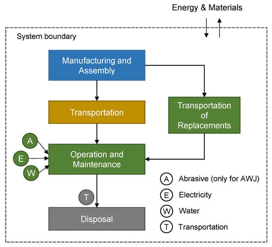 Life cycle assessment (LCA) and life cycle cost assessment (LCCA) are well-suited tools for gaining a detailed understanding on the environmental and economic implications of AWJ and WDM, determining the WDM’s environmental hotspots, and highlighting opportunities for WDM system improvement. LCA quantifies a wide spectrum of environmental impact indicators of a product or system throughout raw material extraction, equipment manufacturing, use, and disposal [11]. It has been previously applied to quantify the environmental impacts associated with various AWJ designs and processes. For instance, Abbatelli (2014) analyzed the life cycle environmental impacts of AWJ cutting using the environmental product declarations (EPD) method [12]. Four types of abrasives were compared, including alluvial garnet, crushed rock, recycled glass, and high-performance synthetic abrasive. This study, however, neglected the production phase of the AWJ equipment and the consumables (nozzles, filters, oil, and spare parts) [12]. Johnson (2009) applied an economic input–output LCA method to quantify the greenhouse gas emissions and energy consumption of three AWJ designs [13]. This study, however, did not consider the raw material extraction, production, and disposal phases of the AWJ machines, as well as the transport of the required consumables during the use phase. Jayakrishna et al. (2019) quantified the embodied energy and the wastewater-associated environmental impacts, including chemical oxygen demand, biochemical oxygen demand, total suspended solids, and total dissolved solids, when using an AWJ to cut a standard gear made of mild steel. Embodied product energies were classified by summing the direct and indirect energies of the AWJ machining process of the gear. This study also ignored the AWJ production and disposal [14].