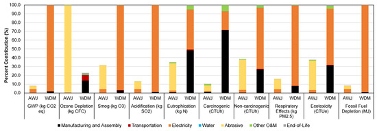 When looking at the LCA results for the waterjet systems, the impacts of WDM are greater across all environmental impacts assessed except for OD (Figure 3). A major factor that has contributed to the WDM’s higher impacts in these categories is the WDM’s much slower cutting speed as compared to the AWJ. The amount of cutting function that can be provided by the AWJ per time unit is about 78 times the cutting function that can be provided by the WDM. If the WDM’s traverse speed is increased by 1150% to 2.95 m/h, WDM will have comparable or lower environmental impacts in all categories as compared to the studied AWJ. In practice, the traverse speed might be improved through a reduction in ambient gas pressure or increased water pressure and thus higher droplet stream velocity. The biggest differences between the two systems comes from the GWP, the FFD, and the CHH, where the WDMs’ impacts are around 12.4, 12.2, and 11.2 times that of the AWJs’ impacts, respectively (Table 5). Electricity use is the highest contributing factor to the WDM’s GWP, SM, AC, NCHH, RE, ET, and FFD impacts. Its CHH impact is primarily contributed by material extraction and manufacturing, with stainless steel and mild steel bearing the greatest burden, as well as electricity. The OD impact is primarily dominated by the machine’s material extraction and manufacturing—specifically for the stainless steel, mild steel, and aluminum components—and transportation to the facility. For its EU impact, both material extraction/manufacturing and electricity are key contributors, representing about 53% and 41% of the total impacts, respectively. To summarize, environmental impacts of WDM are primarily dominated by electricity consumption during the operation phase, which is representative in all impacts except for OD, EU, and CHH. Therefore, improved energy efficiency as well as the greening of the electricity grid may help improve the WDM’s overall environmental performance.