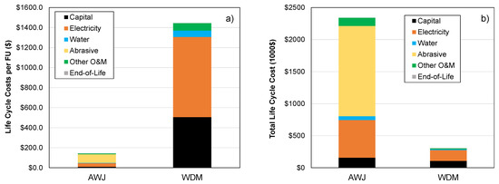 Figure 4 presents the life cycle cost results of the two waterjet systems. Based on the results, the WDM has a higher total life cycle cost per FU than the AWJ, as shown in Figure 4a. The largest contributor to the AWJ’s life cycle cost is the use of abrasive during the O&M phase, which costs about $38.40 per hour to use at 0.73 kg/min [23]. This resulted in a cost of $85.86 per FU. Other significant contributors to the AWJ’s life cycle cost include electricity use, which costs $35.85 per FU. The largest contributor to the WDM’s life cycle cost is its electricity use during the O&M phase, which costs $800.42 per FU, followed by capital cost and operation and maintenance, which are $681.12 and $74.43 per FU, respectively. Similarly, with the LCA, the WDM’s economic performance is also limited by its much lower cutting speed. When the WDM’s cutting speed is increased to about 2.60 m/h, the WDM will have a comparable life cycle cost per functional unit to the AWJ. Figure 4b shows that the life cycle cost of the WDM is much less than that of AWJ over the 20-year service life of the equipment. However, the WDM does not cut nearly as much of the steel used in this analysis as the AWJ, i.e., 21,022 versus 1,639,285 m, respectively.