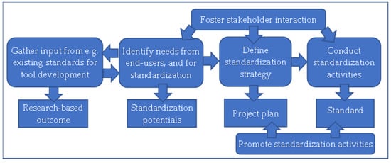 However, the literature on cases such as those mentioned above is very limited. Additionally, these project examples show, on the one hand, the lack of a common approach to the integration of standardization and, on the other hand, the different levels of knowledge about standardization and how it can be successfully implemented as a tool within research activities. However, a recent study on resilience-related research projects concluded with the proposal to consider five steps aimed at integrating standardization, including analysis of existing standards, identifying end-user needs and standardization gaps, developing a standardization strategy, initiating end-user focused standardization activities, and promoting and further exploiting the standardization results [41]. The initiation of standardization activities in European projects mostly led to the development of CWAs [48]. The steps to develop a CWA provide several possibilities to foster engagement with relevant stakeholders, e.g., public availability and commenting possibilities that are a part of the CEN Workshop project plan; the possibility to join CEN Workshops, which are ongoing at any given time; or the opportunity to partake in optional commenting phases of draft standards. Due to the relation of the envisaged standard to a tool or method developed in the project, the CEN Workshop process can also be combined directly with co-creation activities of envisaged project outcomes.