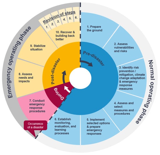 Meanwhile, in the case of the occurrence of a disaster, the “normal operating phase” shown in the light gray outer circle in Figure 3 is disrupted, and leaves the door open for the implementation of Steps 7 through 10. These are focused on emergency response and post-disaster recovery, but are highly dependent on the preparations undertaken in Steps 1 through 6. This phase, the “emergency operating phase”, also has space for a revision of the results of the “normal operating phase”, as denoted in Step 10. This encourages adjustments and additions of new information that may only come from the lived experience of dealing with disaster response and recovery. Likewise, Steps 1 through 6 are clearly geared towards the “emergency operating phase”, and any post-disaster responses should be used as an opportunity to review (CCA) measures and to advance the goals of “Building Back Better”.