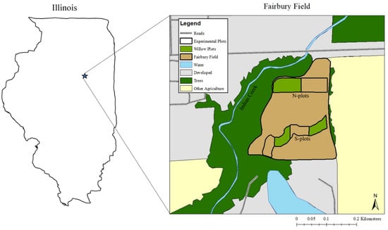 The field experiment was arranged as a randomized block design with two replications of grain (corn and soybean) and short-rotation shrub willow (Salix miyabeana Seemen ‘SX61’) in 0.2-ha plots on two different soil types (marginal and non-marginal land). The northern plots (N-plots) were placed on a lowland floodplain with Comfrey loam soil (fine-loamy, mixed, superactive, mesic Cumulic Endoaquolls; 0–2% slope), which is more fertile with a higher crop productivity for corn. The southern plots (S-plots) were placed on a marginal, uphill plain with Symerton silt loam (fine, loamy, mixed, superactive, mesic Oxyaquic Argiudolls; 2–10% slope), which has greater soil erosion and susceptibility to nutrient loss [].