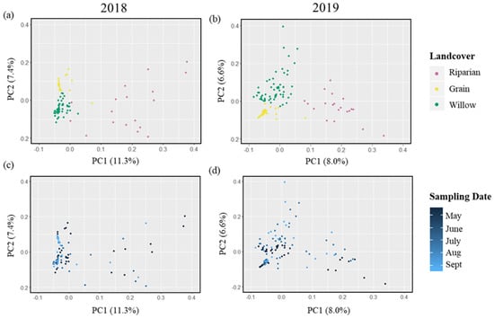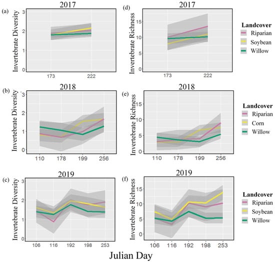 The sampling date was found to have a larger influence on the invertebrate community diversity and richness than the landcover type. During the soybean years (2017 and 2019), invertebrate diversity was not found to differ between landcover types (p = 0.09 and 0.34, respectively). However, the species diversity significantly increased over time across landcover types (Figure 2a,c) with a 10% increase from July to August in 2017 (p = 0.03) and a 20% increase in invertebrate diversity from April to July in 2019 (p < 0.03 for all comparisons). A general decline in species diversity was observed between July and September of 2019; however, that change was not significant (Figure 2c; p > 0.74). Species richness followed similar patterns, with a 25% increase across landcover types in 2017 between July and August (Figure 2d; p = 0.005) and a 48–51% increase in 2019 from April to September, only for riparian and grain plots (Figure 2f; riparian p < 0.001, grain p < 0.001, willow p = 0.72). A similar pattern was observed in 2018, a corn year. Willow plots had numerically higher invertebrate diversity and richness in early April compared to the grain and riparian plots. However, over the season, grain and riparian plots had a general increase in both diversity and richness, resulting in significantly lower diversity and richness in willow plots by September in some cases (Figure 2b,e; grain vs. willow diversity p = 0.03; riparian vs. willow diversity p = 0.47; grain vs. willow richness p = 0.001; riparian vs. willow richness p = 0.1).