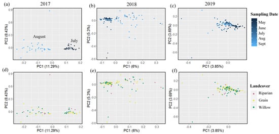 The sampling date and seasonality were also found to influence invertebrate community composition more than the landcover type. The PCA biplots (Figure 3) across all three years show some grouping by sampling date (Figure 3a–c) and less grouping by landcover type (Figure 3d–f). With only two sampling dates in 2017, invertebrate community composition (based on species abundance and presence) showed distinct groupings of samples by sampling date, which were associated with 8 invertebrate species in July and 20 species in August. The RF model agreed with a 2% out-of-bag (OOB) error when the sampling date was used as the response variable. With increased sampling in 2018 and 2019, the RF models found that neither sampling date nor landcover type could explain invertebrate community composition alone, with OOB errors ranging from 34% to 60%.