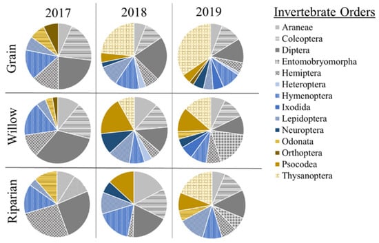 Relative abundance of invertebrate orders observed across the three sampling years (2017–2019) in each of the landcover types (grain, willow, or riparian edge).