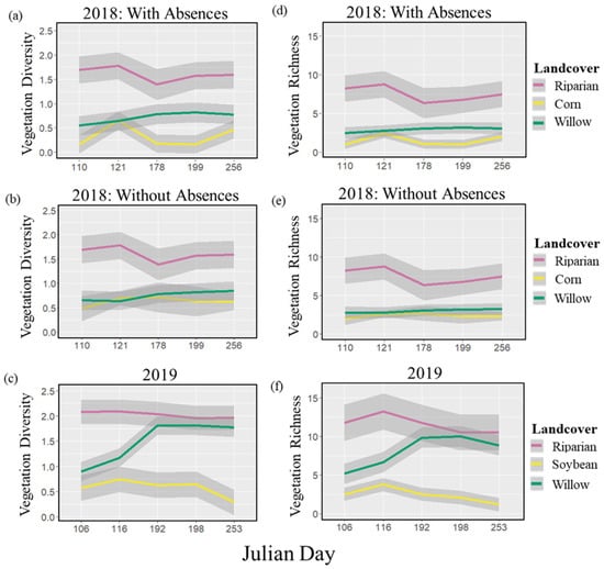 In contrast to the invertebrate results, landcover type had a large effect on the understory plant diversity in both sampling years, 2018 and 2019 (p < 0.001). In 2018, willow plots had a significantly higher chance of having plant diversity greater than zero compared to grain plots, with the chance of observing quadrats without any understory species decreasing through the season (Figure 6a; p < 0.001). Riparian plots, in contrast, always had plant species present. When the linear model was rerun without absences (0 s) included, willow and grain plots had similar plant diversity (p = 0.25), while they both had significantly lower diversity than riparian plots (Figure 6b; p < 0.001). Similar results were observed in species richness, with a significantly greater number of species found in the riparian plots compared to the willow and corn plots in 2018 (Figure 6d,e; p < 0.001).