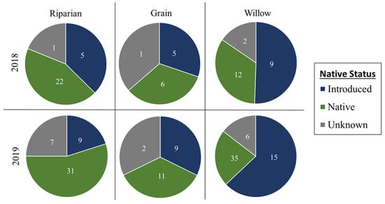 Of the 77 plant species observed in the 2 sampling years (Supplementary Materials Table S2), the willow plots had the highest number of total species observed (56), followed by the riparian (52) and grain plots (24 total species). The riparian and willow plots had the greatest number of plant species in common with one another (25), while another 13 plant species were found to be common across all three landcovers. As observed in the invertebrate community, each landcover also supported unique species (willow—16; riparian—12; grain—7). Unique species that were observed more commonly under each landcover type are shown in Table 2. Between the two sampling years, the majority of understory plants were native species across all three landcovers (grain: 50%; willow: 58%; riparian: 73%). For riparian and grain plots, native species tended to have greater relative ground coverage as well (a measure of abundance) compared to introduced species (Figure 8). For willow plots, however, introduced species were found to have greater ground coverage than native species, which was primarily due to the large presence of red-seeded dandelion (Taraxacum erythrospermum) in the northern willow plots.