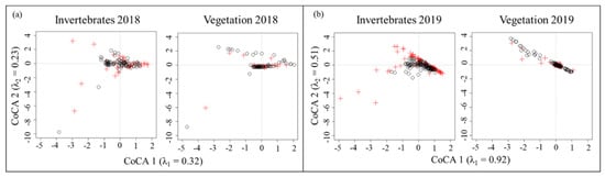 A symmetric co-correspondence analysis (Co-CA) was used to assess the covariation/commonality between the vegetation and invertebrate community matrices. The Co-CA axes from the 2018 data were found to explain 71% of the total variation in the invertebrate matrix and 92% of the total variation in the vegetation matrix. The trend was the same for 2019, with 79% of the variation explained in the invertebrate community and 97% in the vegetation community. The biplots in Figure 9 show the commonality between the two matrices.