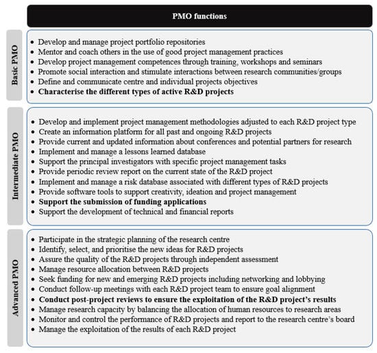 - Fernandes, G.; Bacelar Pinto, E.; Araújo, M.; Machado, R.-J. The roles of a Programme and Project Management Office to support collaborative university–industry R&D. Total Qual. Manag. Bus. Excell. 2018, 31, 1–26. [Google Scholar] [CrossRef]