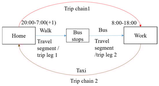 A travel chain, also known as activity-based travel [], refers to activities completed in a continuous period of time to achieve a certain purpose. A trip is defined to start from an origin station near which the previous activity has been finished [], and end at a destination station where the next activity will take place. An example is shown in Figure 1: the commuter first travels from the home to the workplace at 8:00 by walk and bus, stays at the workplace until 18:00, and then take a taxi home. There are two trip chains in this person’s commute trip. Trip Chain 1 is from the home to the workplace, including two travel segments consisting of walking and bus. Travel Chain 2 is from the workplace to the home, only a travel segment [] of taxi.