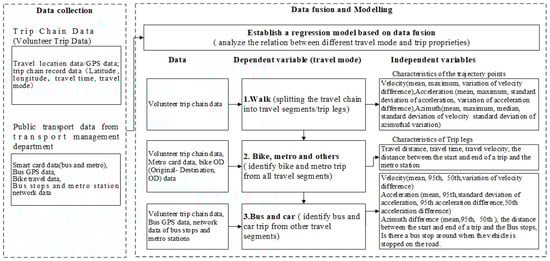 As summarized in Figure 2, the methodology is divided into three parts. The first part is data collection. The aim of this paper is to build different models to identify the travel modes of Internet location data. In order to verify the accuracy of these models, real travel record data is needed. Therefore, we enlisted volunteers to collect travel data and record their travel process using a custom-developed WeChat program. Due to the unbalanced number of trip chains of different travel modes and the sample size being small, we fused the volunteer travel data with the public transportation data from the transport management department to assist modeling. Therefore, we collected three types of data, travel data from the volunteers, travel data from the transport management department, and sample location data from the Internet.