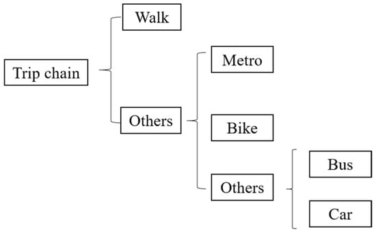 We built a multiple binary classification model. Firstly, the first binary classification model classified the trip chain into walking and others. Secondly, the other data were divided into metro, bicycle, and other by two binary classification models. Finally, a binary classification model was used to distinguish between bus and car. The size of the data used in the model to identify each travel model is as follows.