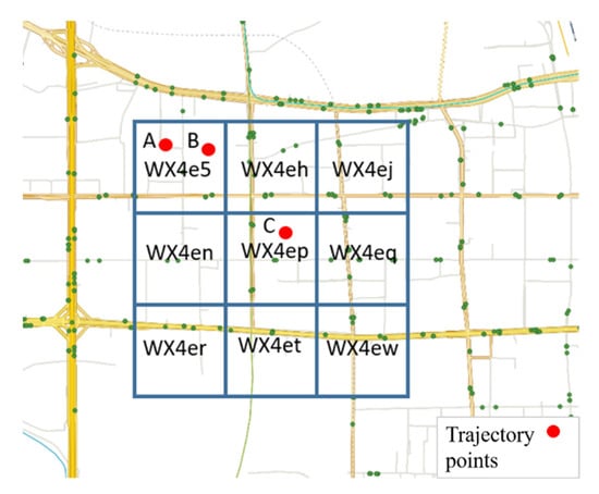 To find whether there is a metro station within 100 m of each trajectory point, we use the Geohash method. Geohash is essentially a form of spatial indexing []. It converts a two-dimensional latitude and longitude into an encoding, each of which represents a certain rectangular area. In other words, all points (latitude and longitude coordinates) in this rectangle share the same Geohash code []. For example, Point A and Point B are in the same rectangle and they share a Geohash code WX4e5, but Point C with the number WX4ep is not in the same rectangle as them (Figure 4). This can help us to find the metro or bus station around the track point quickly.