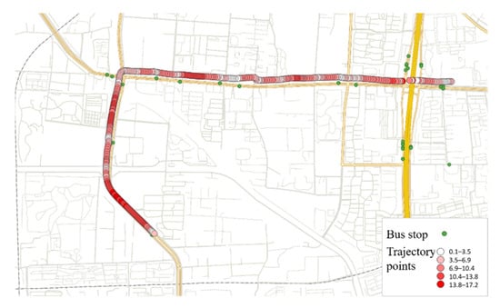 In addition, the distance between the origin and destination of a trip and the bus stops also helps us to determine whether the trip is a bus trip. For example, for a bus trip, whether or not they stop near a bus stop and where the origin and destination are located at the bus stop can help us to evaluate the results. Figure 5 shows a travel segment of bus identified by applying the model we have built. The red color is a series of trajectory points, the shade of color represents the speed of the point (the greater the speed, the darker the color), and the green color is the bus stop. We can see that the segment of the trip starts and ends at a bus stop and has stops at bus stops along the way, and travel speed tends to decrease and then increase near bus stops.