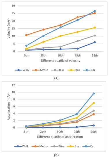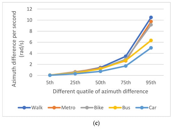 From Figure 6a, we can see that the 95th percentile velocity for walk, bike, bus, metro, and car are 6, 10, 16, 25, and 26 m/s, respectively. There is little difference in this value between metro and car, so we can use the 95th percentile velocity to distinguish walk, bike, and bus, but we cannot distinguish metro and car. The 25th percentile velocity of metro and car are 14 and 10 m/s respectively, so we can use the 25th percentile velocity to distinguish these two modes of travel. We can see that the 95th percentile acceleration can initially analyze different modes of transportation from Figure 6b. Since the 95th percentile acceleration for walk, bike, bus, metro, and car are 0.6, 1, 2.2, 2.7, and 3.2 m/s2, respectively. The azimuth difference is not significant to distinguish different travel modes in Figure 6c since the values for different travel modes are relatively close.