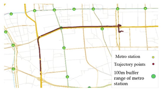 Figure 6 shows the relationship between the trajectory points (red) and the metro station (yellow) for a section of travel, and green indicates the 100 m buffer range of the metro station. We assist in determining whether the trip is a metro trip by checking whether the start or end point of the trip is located within the green buffer of the metro station. We observe whether the starting or ending point of one trip is located within the green buffer of the subway station to assist in determining whether the trip is a metro trip. From Figure 7, we can see that none of the starting and ending points are within 100 m of the metro station, so we initially obtain that this trip is not a metro trip.