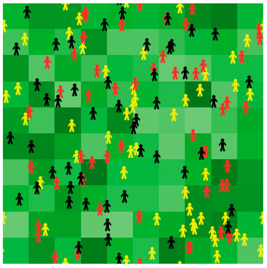 Figure 1 shows the decision environment in Netlogo, in which three types of consumers interact information with each other during the process of purchasing NEVs. Yellow, red, and black represent Rookie, Veteran, and New generation on the different geographic sections, respectively. Different shades of green represent different regions, which are called patches in Netlogo.