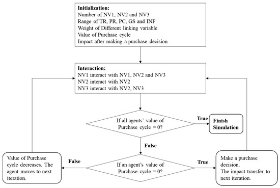 Initialization is the first step, and its specification is shown in Figure 2. The number of agents refers to the interaction ratio and the per interaction frequency. The ranges of linking variables uniformly distribute on interval values, which vary with different types of agents. The weight of linking variables is determined by a random integer. The value of the purchase cycle diminishes with iteration proceeding and becomes zero with stopping iteration. A purchase decision will leave an impact on some regions and influence adjacent agents’ NEVP.