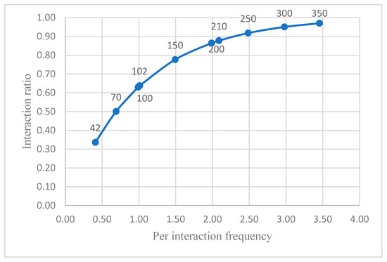 It needs to determine the size of the behavior space and the number of agents in a simulation, which will influence per interaction frequency and interaction ratio . It is assumed that a square with 100 patches form the simulation space, which is 10 patches long and 10 patches wide. If N persons stay on the same patch, the maximum interaction number is . Considering the different number of agents on different patches, is employed to indicate the number of patches with i persons. The equations have the following forms: